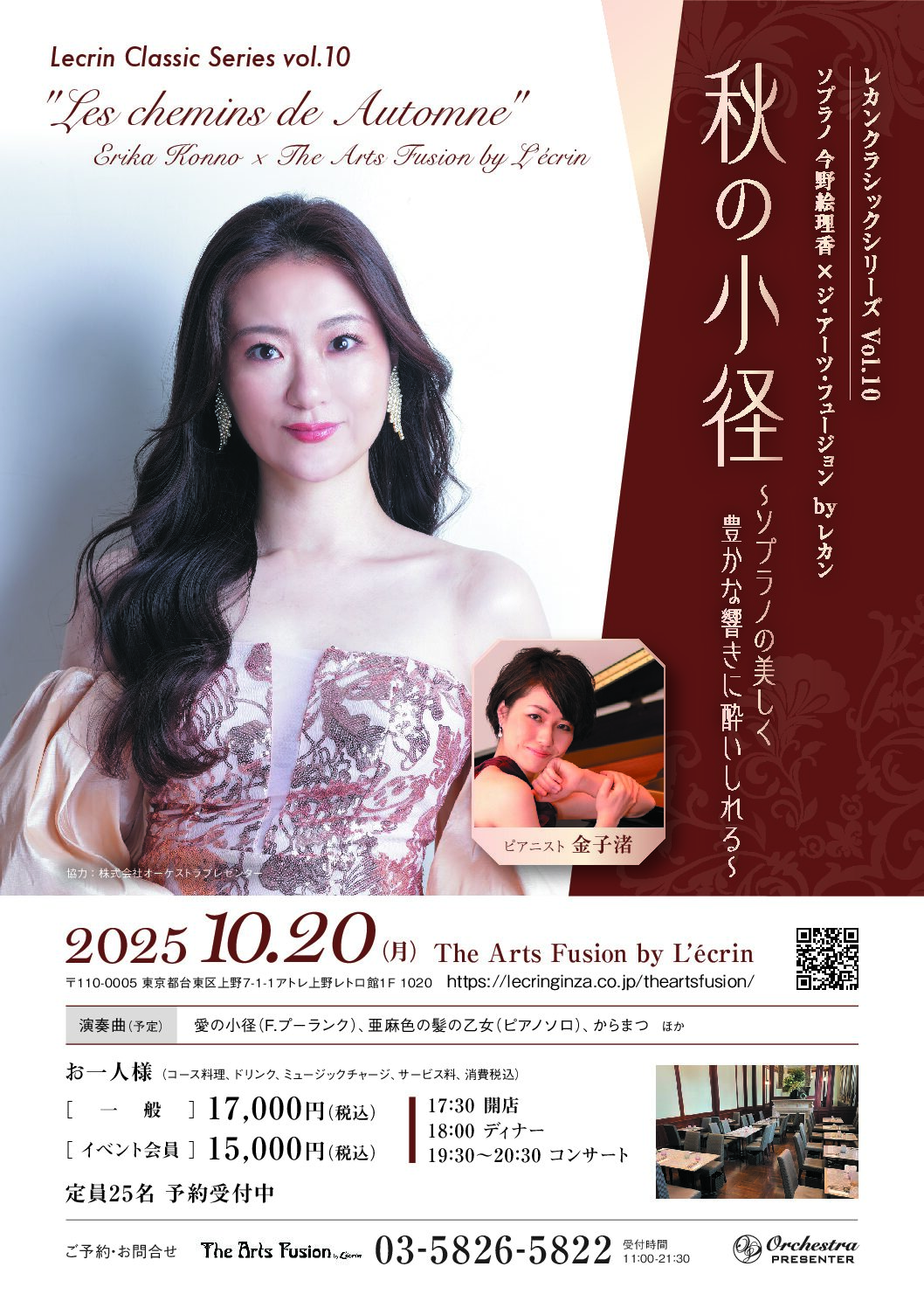 The Arts Fusion by Lécrin にて、大人気企画「レカン クラシックシリーズ」 ご好評により第10回目の開催内容が確定いたしました。 ソプラノ歌手 今野絵理香×The Arts Fusi […]