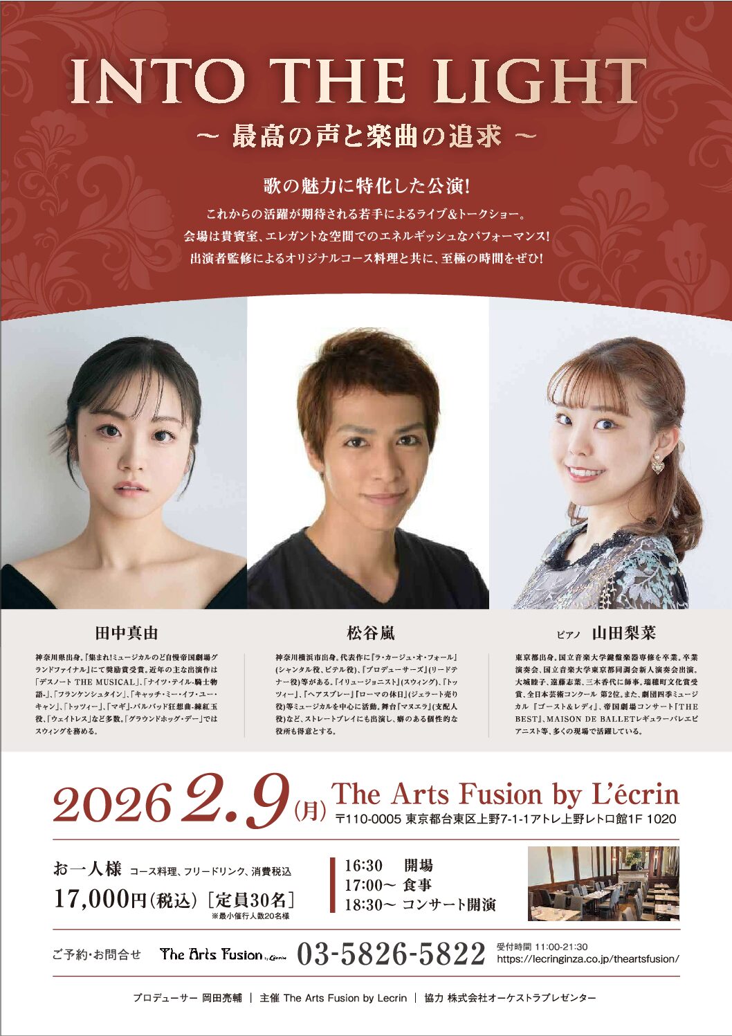 The Arts Fusion by Lecrin の新たな音楽イベントが誕生いたします。 今回はミュージカル俳優とのコラボレーション! ピアノと共に若手俳優の【松谷嵐】さんと【田中真由】さんが 誰もが知っている名曲や、 […]